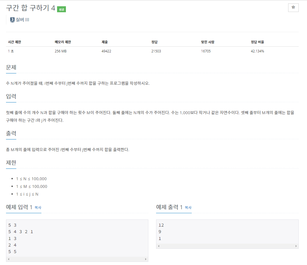 문제풀이 처음 이 문제를 보았을 때는, 두번째에 주어진 숫자들을(5 4 3 2 1) 리스트로 생성하고, M개의 줄에 입력 받을 숫자들 (1, 3), (2, 4), (5, 5) 를 인덱싱으로 접근해서 풀이하였지만 시간초과 # 구간 합 구하기 4 n,m = map(int,input().split()) n_list = list(map(int,input().split())) # [5, 4, 3, 2, 1] for _ in range(m): first, end = map(int,input().split()) first -= 1 add = 0 for i in range(first, end): add += n_list[i] print(add) 그 이유는 N개의 원소로 이루어진 배열이 주어졌을 때, 반복문을 통해 부분..